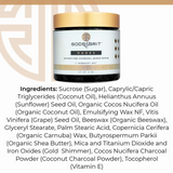 Hades Key Ingredients: Sugar, Activated Coconut Charcoal Powder, Organic Coconut Oil, Grape Seed Oil, Organic Beeswax, Organic Shea Butter, Vitamin E, Gold Mica